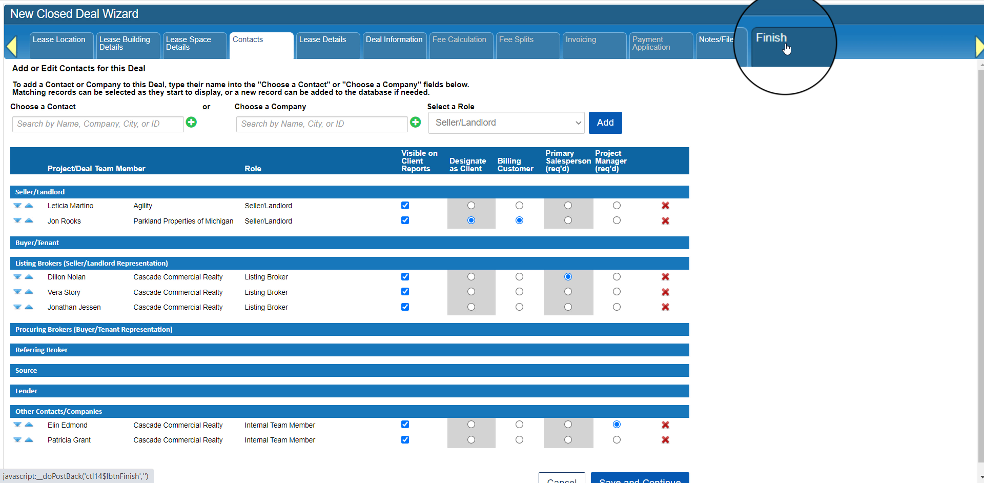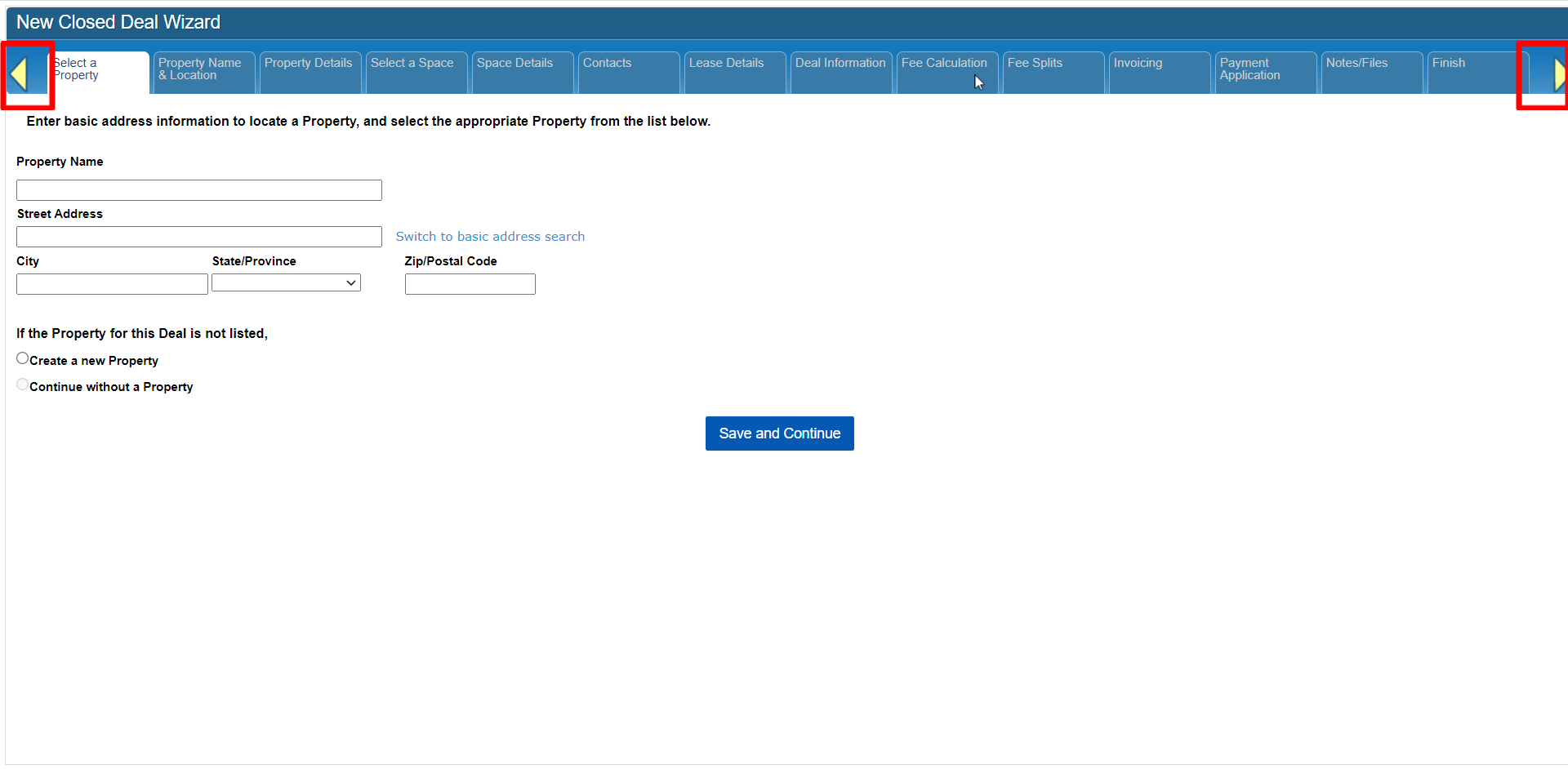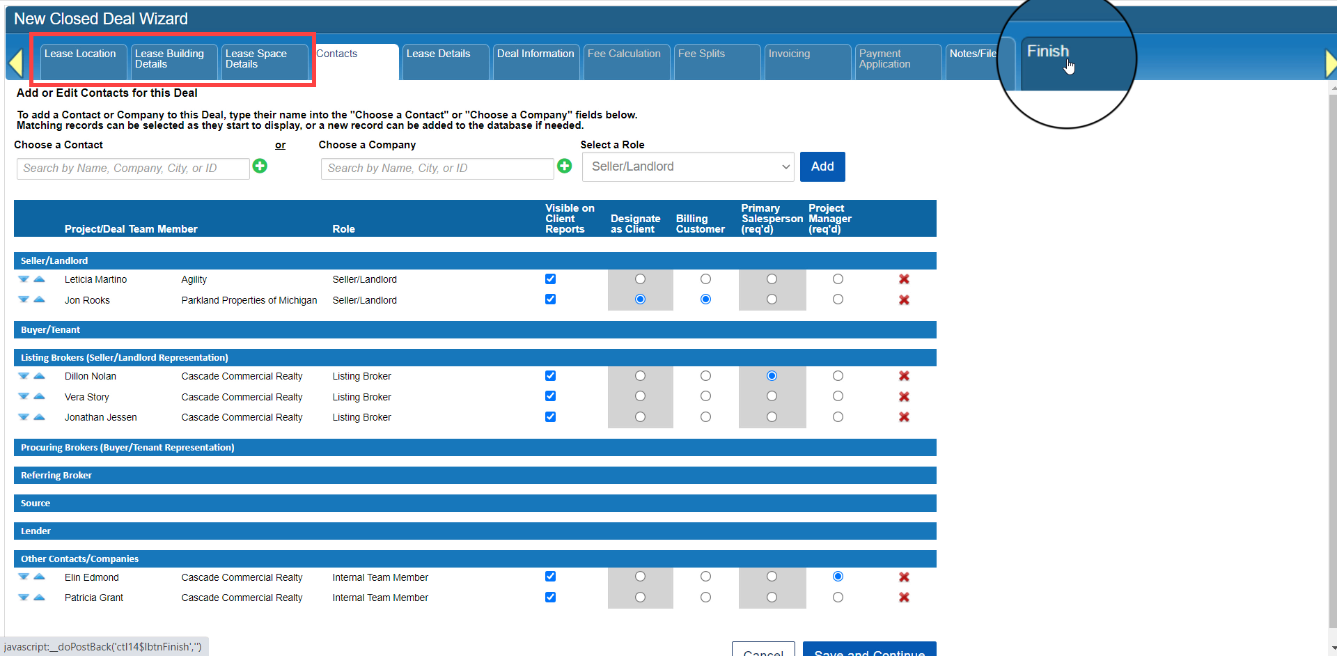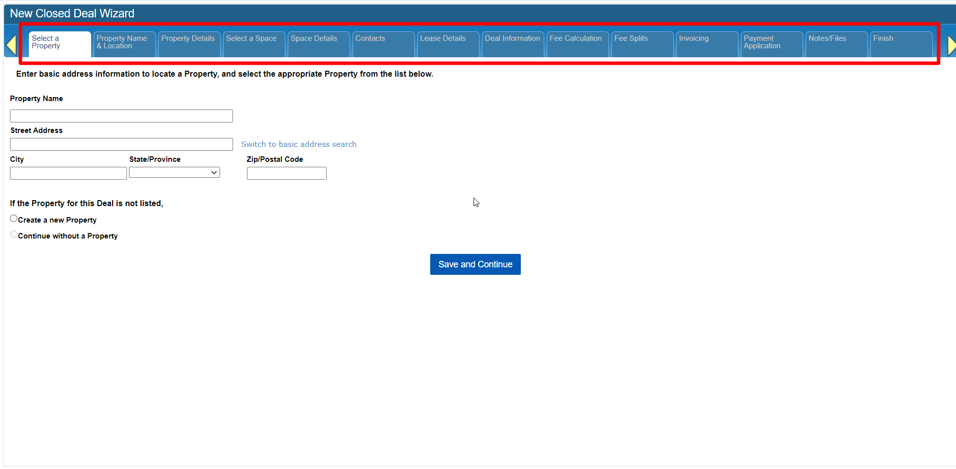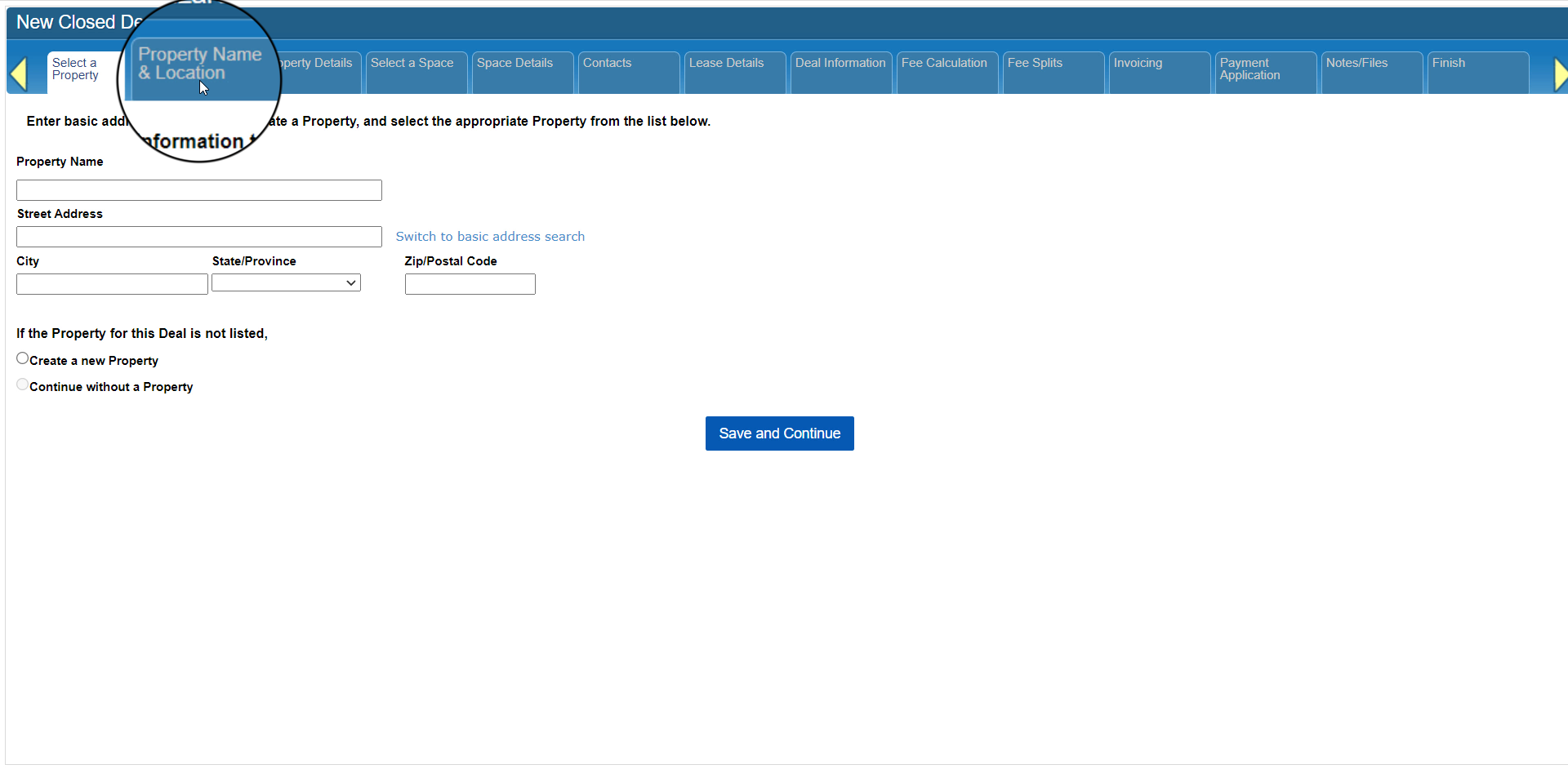 For example, the Finish tab at the far right will become unlocked once you have completed the minimum steps for this type of Closed Deal. In the case of Lease or Sale deals, you must at least complete the steps for defining Property and Space information.