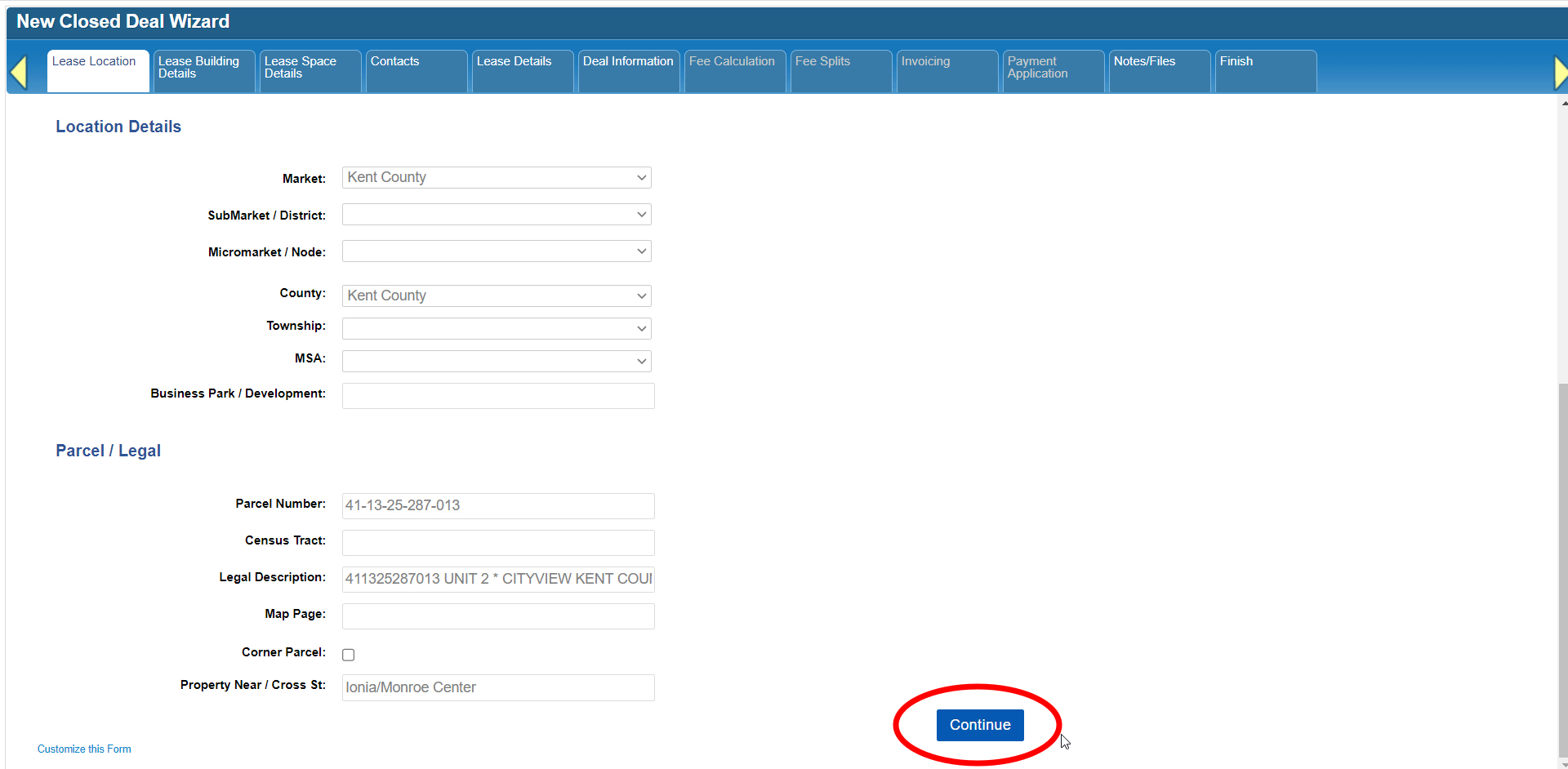 In most cases (and especially when entering a new Closed Deal), you’ll move to each next step by clicking on the option to Continue, which is on the form below the tabs.