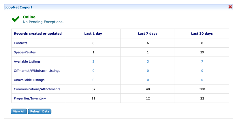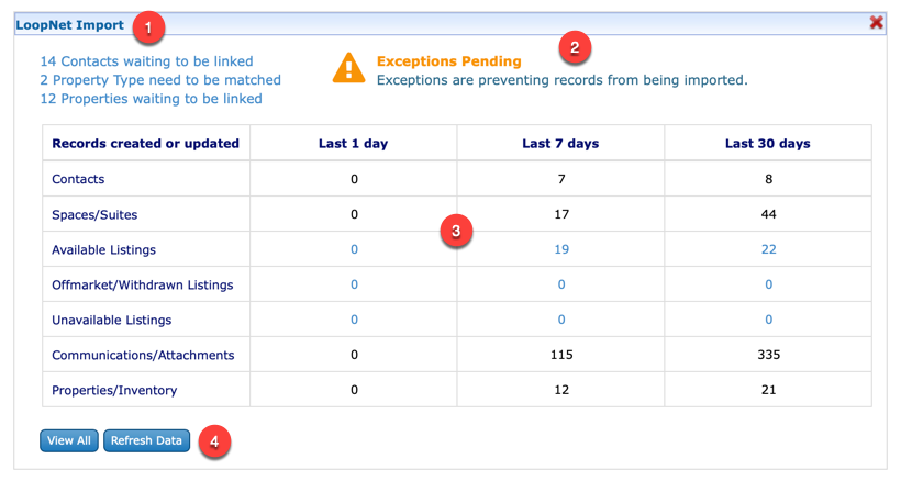 As part of the upgrade for this process, we have updated the ‘LoopNet Import’ widget. The updated widget format will allow a user who has oversight into this process to quickly identify the status of the process, make decisions on any exceptions, and see the various record types that have been processed.