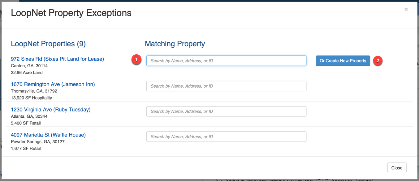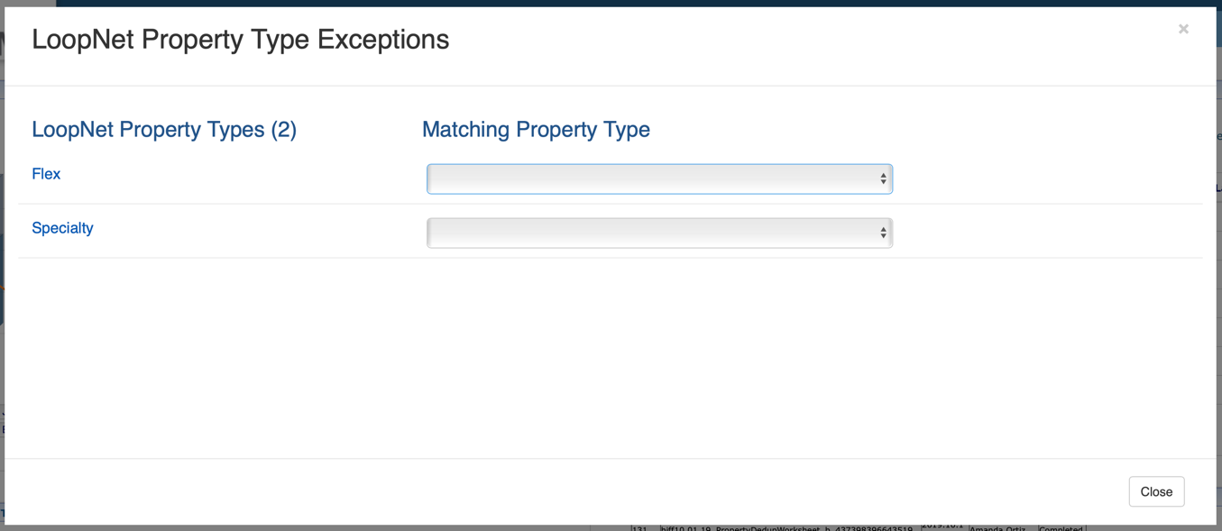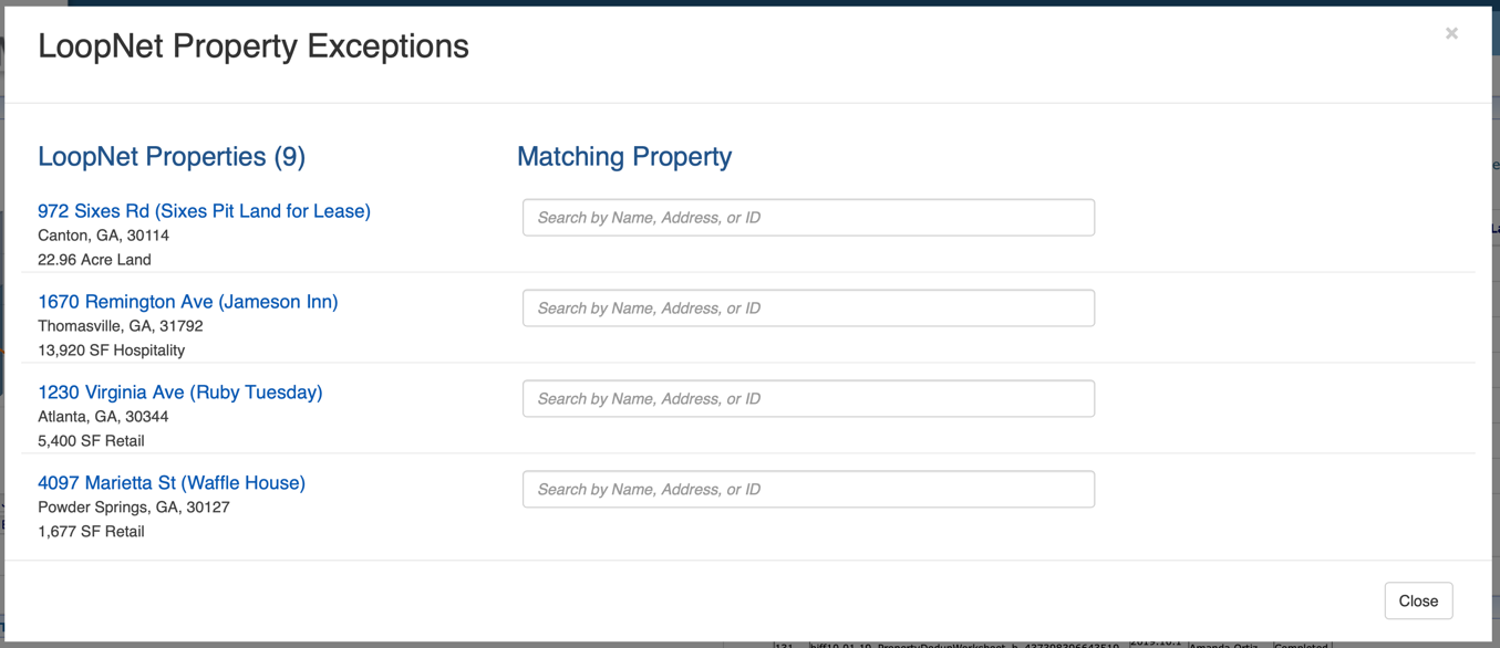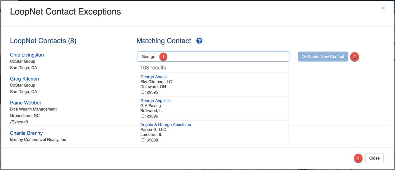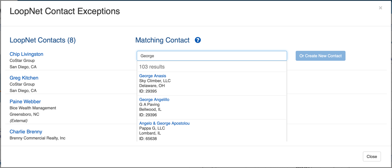 Once a LoopNet Contact has been matched, the row disappears. Once all LoopNet Contacts have been matched the form will close automatically. Clicking the ‘close’ button will close the form, but all exceptions must be cleared for the import process to continue .