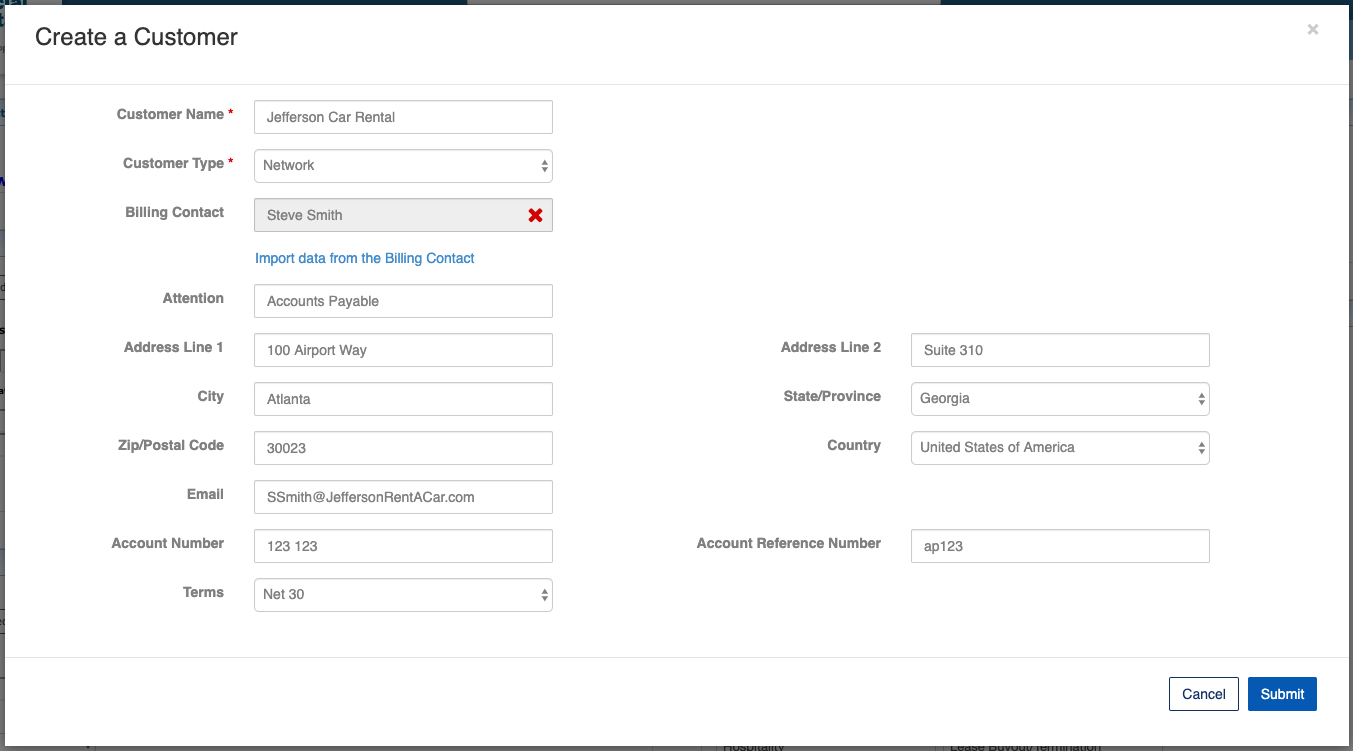 For ease of entry, you have the ability to copy the Billing Contact information to the new Customer record in two scenarios. First, when you first pick the Billing Contact, you will be prompted to confirm you are interested in copying the information. Second, you have the ability to copy the data at any point using the ‘Import data from the Billing Contact’ link. The fields that have the potential to migrate from the Billing Contact include: Attention , Address Line 1, Address Line 2, City, State/Province, Zip/Postal Code, Country, and Email.