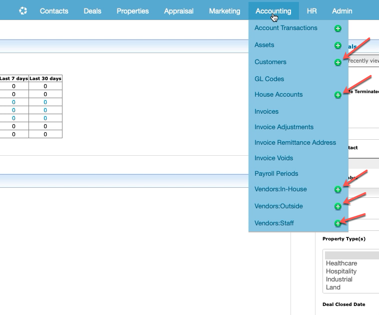 Main Dashboard: Accounting Menu: Green Plus Icon