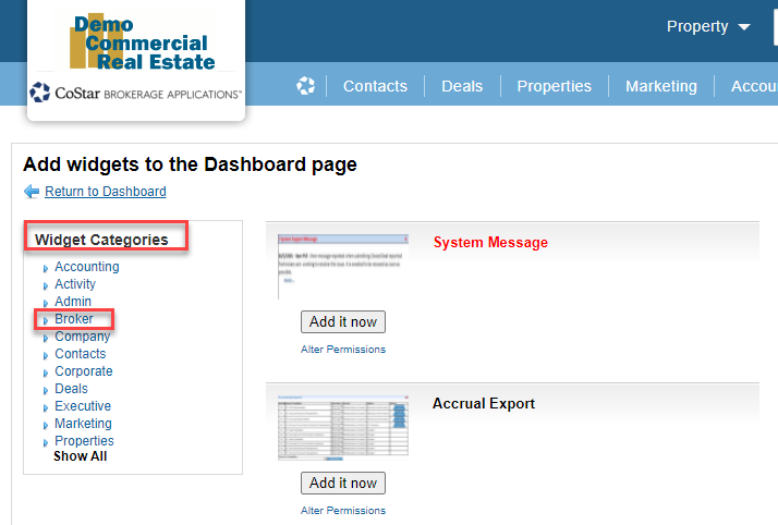 Widgets are categorized by the type of user they would be most useful for. To learn more about the widgets that are categorized for brokers click (LEARN MORE).