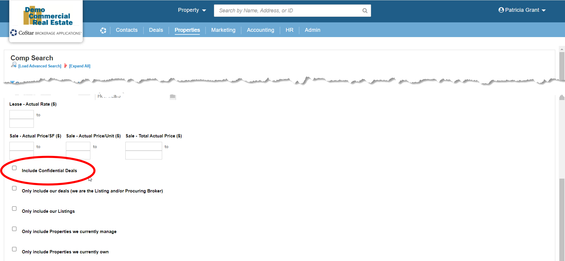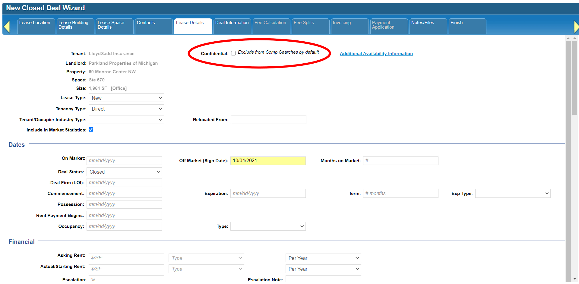 At the top of the Lease Details, Sale Details and Deal Information forms is an option to mark this comp as Confidential. This does not hide the comp record from other users in your database – that’s always determined by the record’s Permissions settings. The Confidential setting allows you to indicate that this deal should not be shared externally.