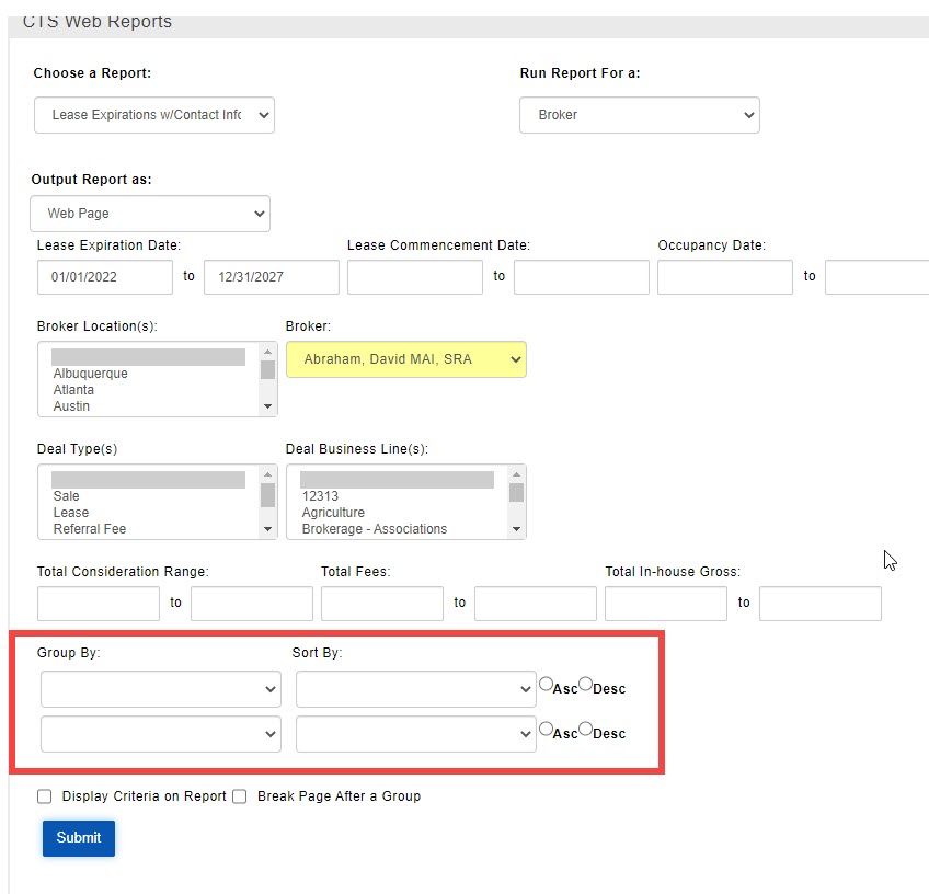Generally speaking, each Web Report is already “pre-filtered” to display only relevant records for that report’s specific purpose. For example, a Lease Expiration report is only going to include Deals which contain a Lease Expiration Date. Depending on the report, you can add more filters to make sure the results meet your specific requirements. Common filters include key dates or amounts, Locations, Business Lines, Deal Type(s), and more.
